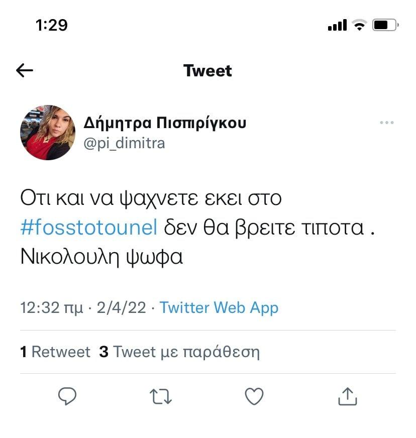 Να τονίσουμε επίσης ότι όσο προβαλλόταν η εκπομπή, το #fosstotounel είχε κερδίσει την πρωτιά στα trends του tweeter παγκοσμίως.