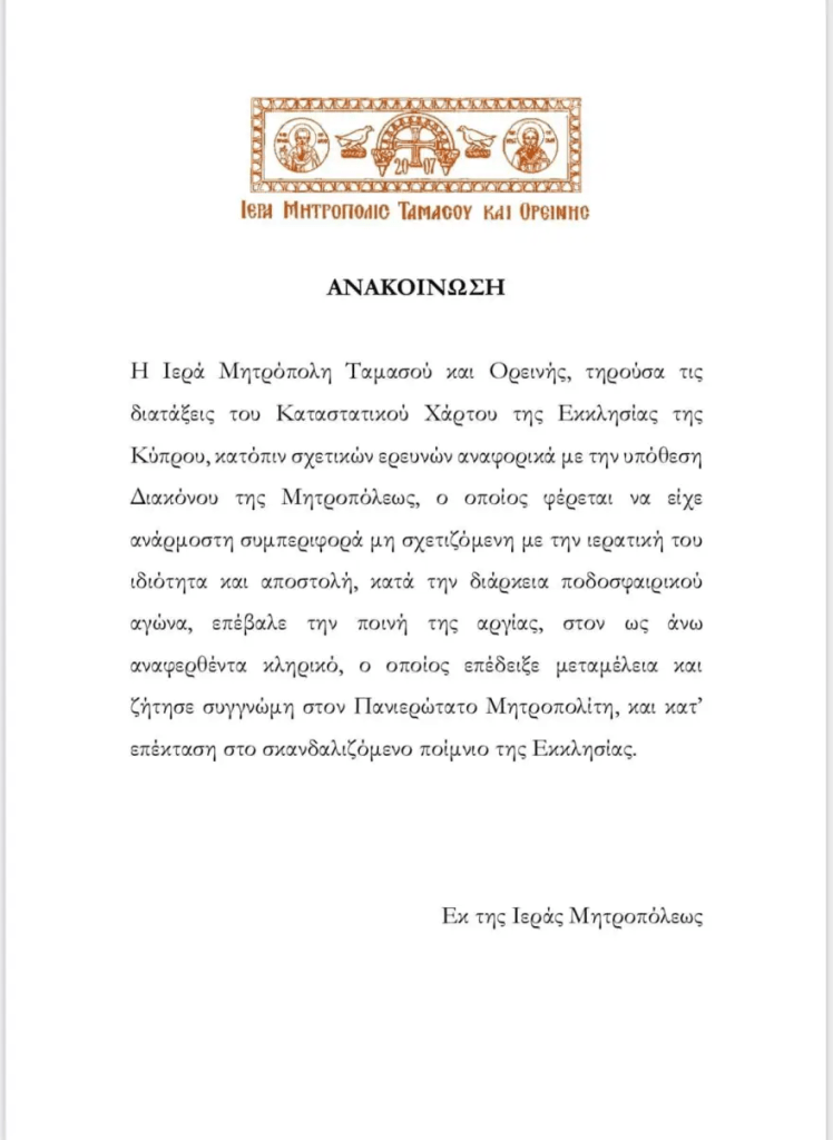 Κόλαφος η ανακοίνωση της Ιεράς Μητρόπολης Ταμασσού και Ορεινής: