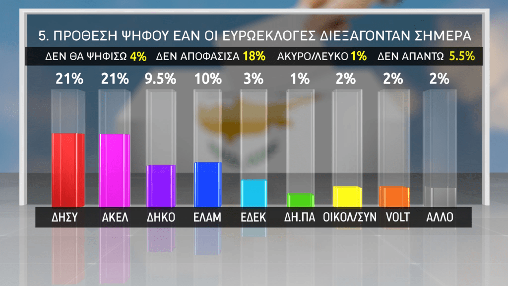 - Στην δημοσκόπηση που παρουσίασε το κανάλι ΣΙΓΜΑ, η ΕΔΕΚ εμφανίζεται στην 5η θέση με ποσοστό 3%. Ποσοστό αρκετά μακριά από την εκλογή ευρωβουλευτή.