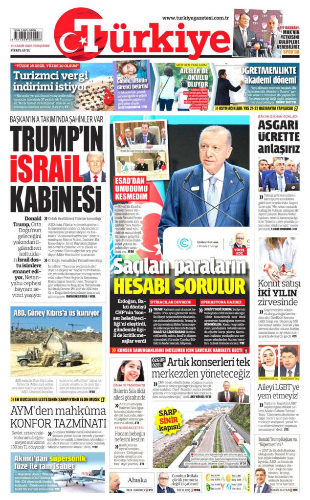 Η τουρκική φιλοκυβερνητική εφημερίδα Τουρκίγε υπό τον τίτλο «Υπουργικό Συμβούλιο Ισραήλ του Τραμπ», γράφει ότι ο Ντόναλντ Τραμπ εμπιστεύεται τις θέσεις οι οποίες παρακολουθούν στενά τη Μέση Ανατολή σε ονόματα που είναι φίλοι του Ισραήλ και ότι ο Νετανιάχου πανηγυρίζει.