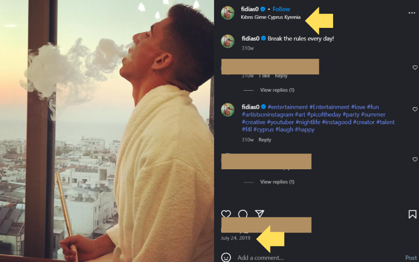 Σε ανάρτησή του στα Μέσα Κοινωνικής Δικτύωσης το 2019, ο από το έτος 2024 Ευρωβουλευτής της Κυπριακής Δημοκρατίας, Φειδίας Παναγιώτου, φαίνεται να απολάμβανε τις καλοκαιρινές του διακοπές με περιγραφή δημοσίευσης, «Σπάσε τους κανόνες κάθε μέρα!» στην τοποθεσία Κερύνεια… Όπως χαρακτηριστικά γράφει την τοποθεσία η πλατφόρμα του Instagram «Kıbrıs Girne Cyprus Kyrenia».