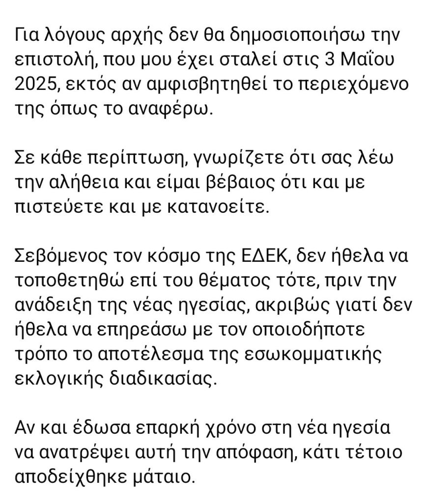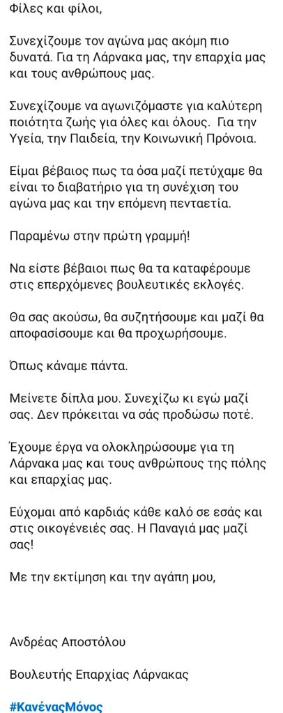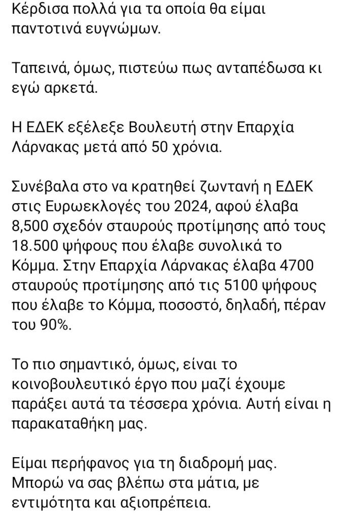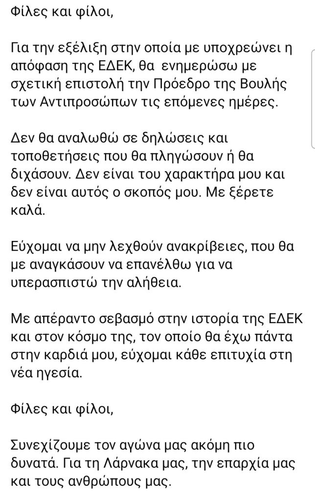 Ο βουλευτής της ΕΔΕΚ, Ανδρέας Αποστόλου, μεταξύ άλλων αναφέρει, «μετά από τέσσερα χρόνια κοινοβουλευτικής συνεργασίας με την ΕΔΕΚ, μού κοινοποιήθηκε η απόφαση του Κόμματος ότι δεν μου επιτρέπεται να διεκδικήσω οποιαδήποτε θέση στην ηγεσία γιατί, όπως αναφέρεται σε σχετική επιστολή, είμαι συνεργαζόμενος προερχόμενος από τη Συμμαχία Πολιτών και εκλέγηκα Βουλευτής στο πλαίσιο της συνεργασίας των δύο κομμάτων στις βουλευτικές εκλογές του 2021».