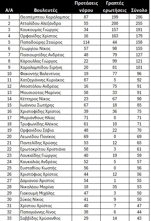 Σύμφωνα με τα όσα παρουσίασε η πλατφόρμα nomoplatform, η λίστα συμπληρώνεται με βάση το συνολικό αριθμό προτάσεων νόμου που έχει καταθέσει ο κάθε βουλευτής και των γραπτών ερωτήσεων από την έναρξη της τρέχουσας κοινοβουλευτικής περιόδου μέχρι και την τελευταία ολομέλεια στις 10 Ιουλίου.
